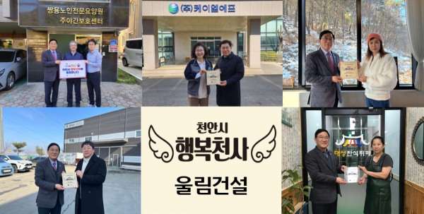 한편 천안시복지재단의 기부 캠페인 중 하나인 ‘행복천사’는 월 5만원 이상의 정기후원을 통해 나눔을 실천하는 사업자으로 2024년 1분기에 ▲ 쌍용노인전문요양원 ▲대성한식뷔페 ▲성성나래어린이집 ▲광덕 자두 라이브 카페&펜션 ▲준테크 ▲울림건설 ▲㈜케이엠에프 등의 기업과 단체가 행복천사에 가입해 후원에 동참하고 있다.