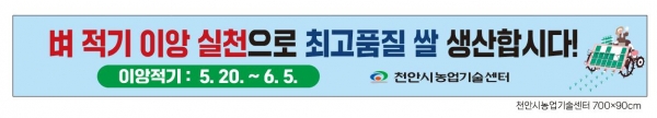 [세종타임즈] 천안시농업기술센터는 최고품질 흥타령쌀 생산을 위해 오는 7일부터 20일까지를 적기 모내기 중점 지도기간으로 정하고 현수막 게시를 통한 홍보 및 적극적인 현장지도에 나섰다고 8일 밝혔다.