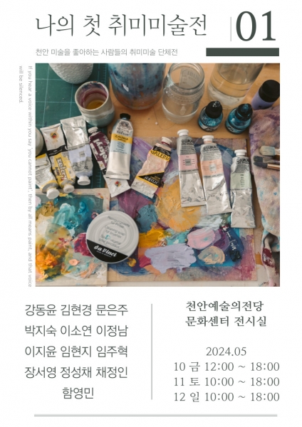 [세종타임즈] 천안문화재단은 오는 5월 10일부터 12일까지 천안예술의전당 문화센터 1층 전시실에서 천안 나의 첫 취미미술 소모임의 회원 작품들을 일반에게 선보이는 ‘나의 첫 취미미술전’을 개최한다고 8일 밝혔다.