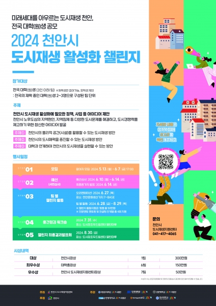 참가 신청은 6월 7일까지 천안시도시재생지원센터 누리집에서 가능하며 이후 예선 심사를 거쳐 본선 진출 팀을 선정하고 단계별 전문코칭을 통해 8월 말 결과발표회에서 우수 아이디어를 선발할 계획이다.