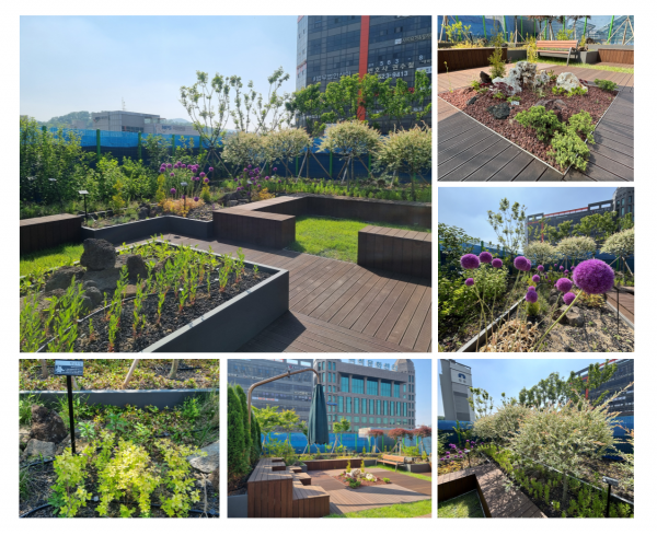옥상정원에는 초화류 10종과 교목5종 등 다양한 식물이 심어져 있고 야외정원에 있는 듯한 분위기를 느낄 수 있도록 데크로 유휴공간을 마련해 시민과 직원 모두에게 휴식과 힐링을 제공하는 공간으로 구성했다.