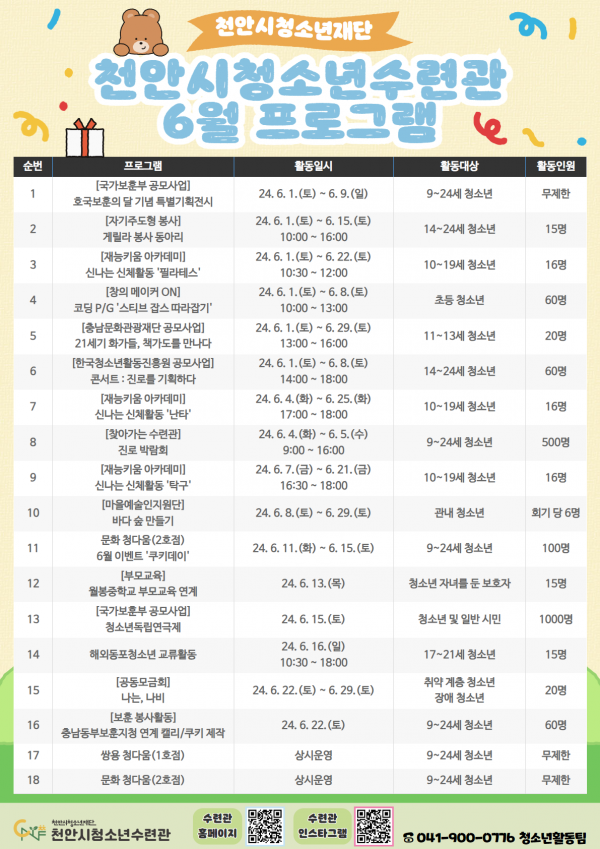 [세종타임즈] 천안시청소년수련관은 6월 호국보훈의 달과 환경의 달을 맞이해 18개 프로그램 참가자를 모집한다고 31일 밝혔다.