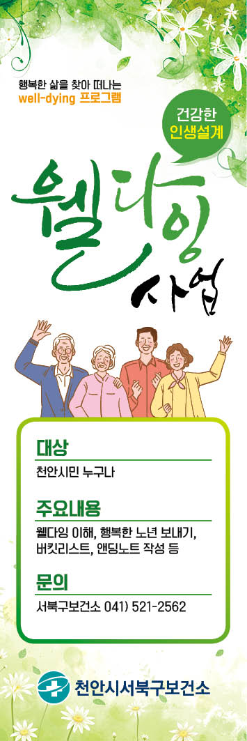 이현기 서북구 보건소장은 “웰다잉에 대한 인식 개선은 고령화 시대에 발맞춘 우리의 시대적 과제이다”며 “‘건강한 인생설계’ 강좌를 통해죽음에 대한 인식을 개선하고 웰다잉 문화조성이 확산될 수 있길 기대한다”고 말했다.