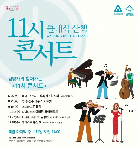 총 6회로 진행되는 ‘11시 콘서트’는 6월 26일 테너‘류정필’, 소프라노‘원지혜’의 아름다운 성악 하모니를 시작으로 △8월 리수스 콰르텟 △9월 소프라노 ‘강혜정’△10월 피아니스트 ‘아비람 라이케르트’△11월 바이올리니스트 ‘임동민’△12월 첼리스트 ‘홍진호’가 2024년 ‘11시 콘서트’와 함께한다.