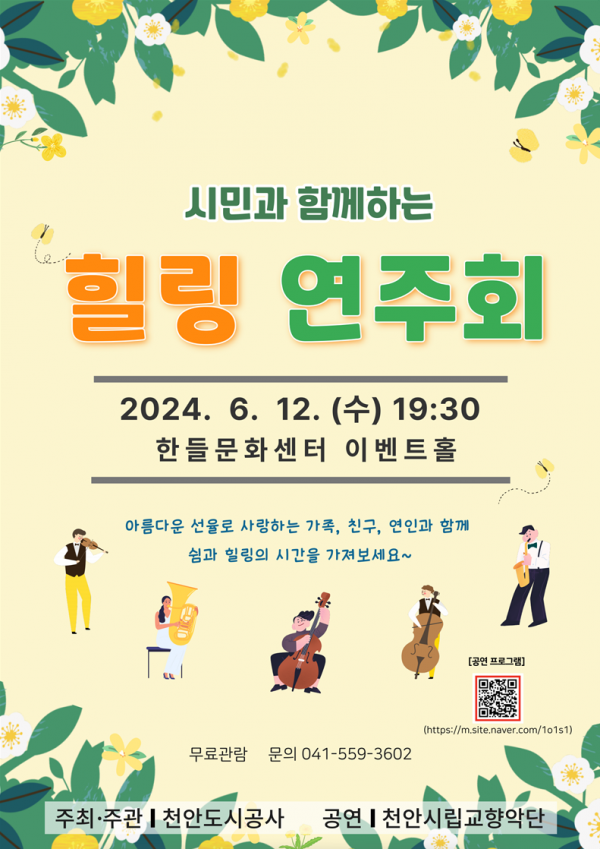 [세종타임즈] 천안도시공사는 오는 12일 오후 7시 30분 한들문화센터 이벤트홀에서 시민과 함께하는 힐링 연주회를 개최한다.