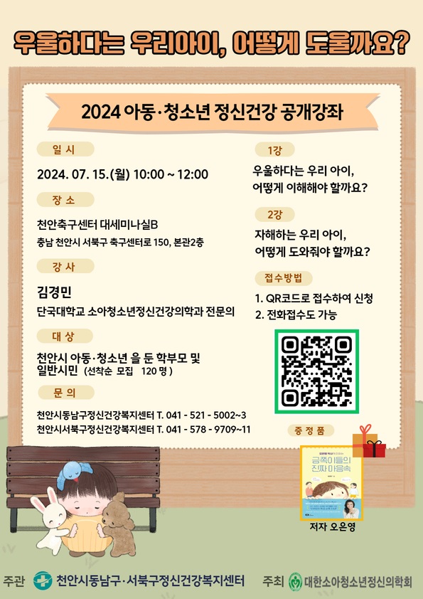 강좌는 단국대학교병원 정신건강의학과 김경민 교수가 1부에서는 우울하다는 우리 아이 어떻게 도울까요? 2부에서는 자해하는 우리 아이 어떻게 도와줘야 할까요? 로 2시간동안 진행되며 사전접수를 통해 선착순 모집하고 있다.