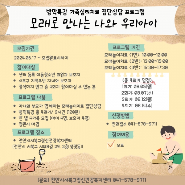 [세종타임즈] 천안시 서북구 정신건강복지센터는 여름방학을 맞아 부모와 자녀가 함께하는 방학특강 가족심리치료 ‘모래로 만나는 나와 우리아이’집단상담 프로그램을 운영한다고 17일 밝혔다.