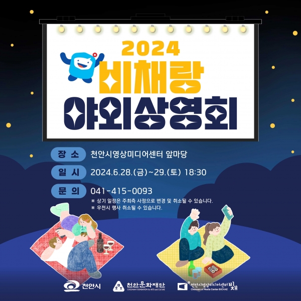 [세종타임즈] 천안문화재단 천안시영상미디어센터가 ‘2024 비채랑 야외 상영회’를 오는 28일부터 29일까지 이틀간 천안시영상미디어센터 앞마당에서 운영한다고 밝혔다.