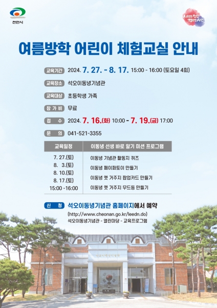 [세종타임즈] 천안시 시적관리소는 7월 27일부터 8월 17일까지 매주 토요일에 천안시 동남구 목천읍에 위치한 이동녕기념관에서 초등학생 가족을 대상으로 한 ‘여름방학 어린이 체험교실’을 실시한다고 밝혔다.