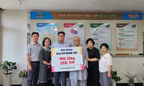 이날 전달식에는 광덕사 주지 스님과 광덕면장 등이 참석했으며 기부받은 쌀은 도움이 필요한 취약계층 등에 전달될 예정이다.