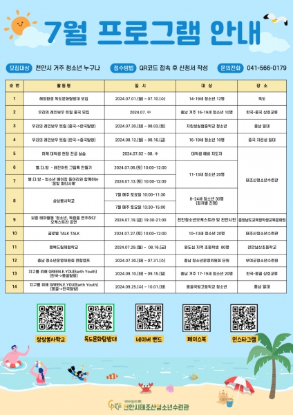 [세종타임즈] 천안시청소년재단 태조산청소년수련관은 7월 한 달간 해양환경 독도문화탐방대 등 10여 개의 청소년 프로그램을 운영한다.
