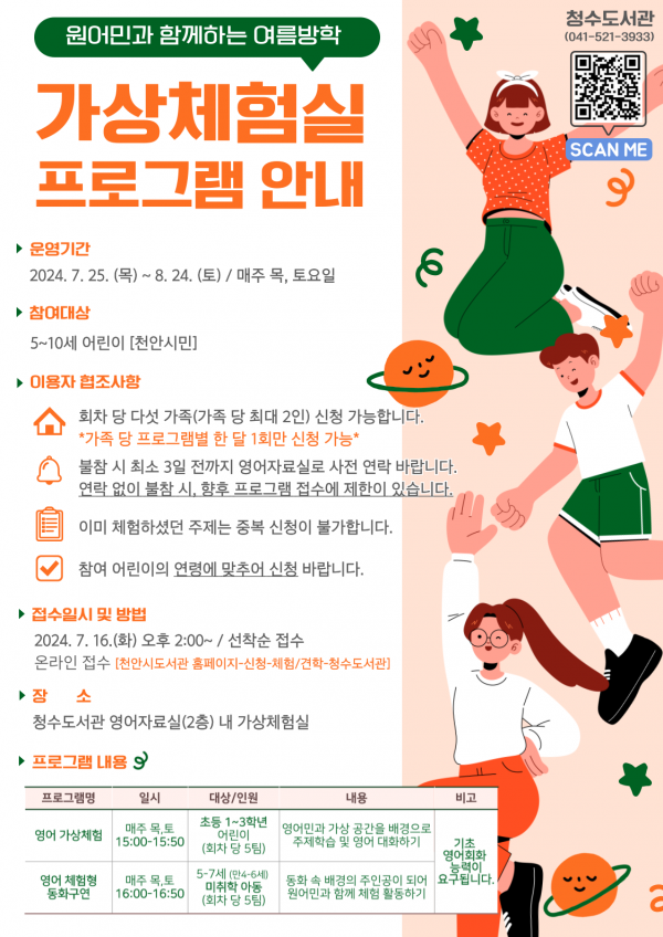 [세종타임즈] 천안시 청수도서관은 2024년 7월부터 8월 2개월간 ‘원어민과 함께하는 여름방학 가상체험실 프로그램’을 지속 운영한다고 9일 밝혔다.