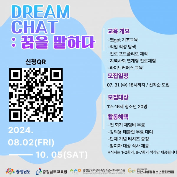 [세종타임즈] 천안시청소년재단 천안시성정청소년문화의집은 31일까지 청소년 대상 디지털 역량 강화 프로그램 ‘Dream Chat: 꿈을 말하다’ 참가자를 모집한다고 밝혔다.