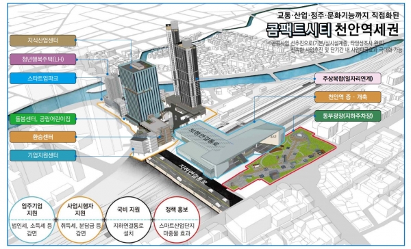 지하연결통로 내 미디어 터널 조성과 동·서 환승교통망 확보, 지식산업센터 내 기업 유치, 스마트 주차장 조성 등 민간 투자를 활성화해 천안역을 중심으로 한 동서간 지역 균형 발전 사업으로 추진해 나갈 예정이다.