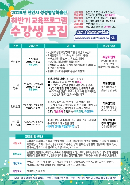 만 19세 이상 천안시민은 누구나 성정평생학습관 누리집을 통해 수강 신청이 가능하며 신청은 선착순 접수로 진행된다.