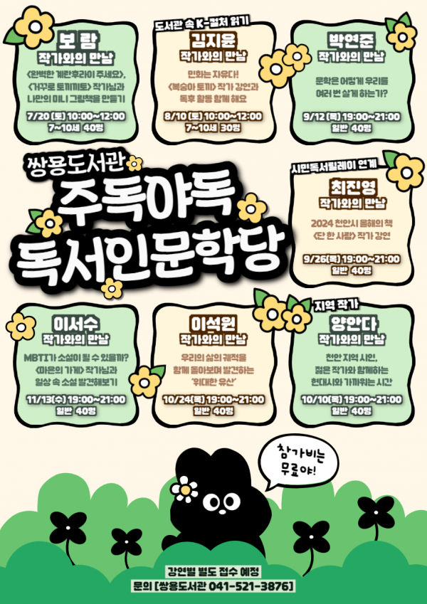 [세종타임즈] 천안시 쌍용도서관은 지역주민의 생활 속 문화예술 향유를 위한 ‘음표 위의 문학’과 ‘주독야독 독서인문학당’을 연계해 ‘2024 릴레이 작가와의 만남’ 프로그램을 운영한다고 밝혔다.