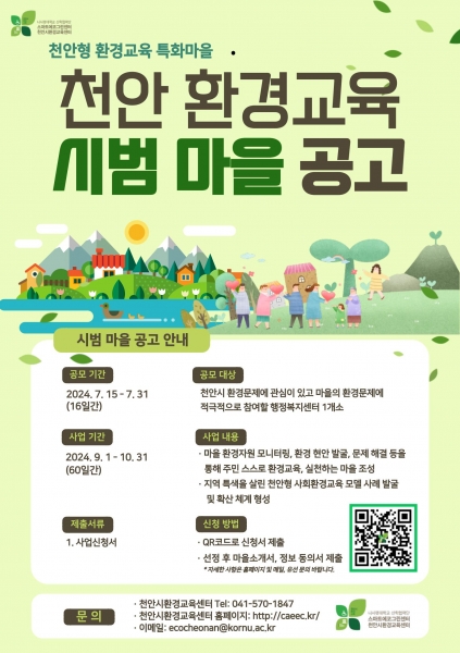 [세종타임즈] 천안시와 천안시환경교육센터는 31일까지 ‘환경교육 시범 마을’ 사업에 참여할 행정복지센터를 모집한다.