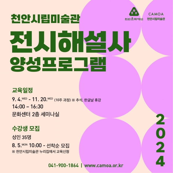 [세종타임즈] 천안문화재단 천안시립미술관은 ‘2024 전시 해설사 양성프로그램’ 참여자를 다음 달 5일 오전 10시부터 선착순 모집한다고 밝혔다.