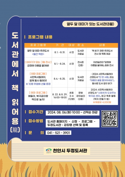 또한, 도서관에서 ‘책 읽어용’을 부제로 올해 시민독서 릴레이 일반·청소년 부문 선정도서와 연계한 ‘시민독서릴레이, 함께 필사 릴레이’행사를 운영하며 아동 부문 선정도서인 ‘시원하게 도와주는 북극곰 센터’를 독후활동으로 만나는 초등 3~4학년 대상의 ‘얘들아, 북극곰이랑 책으로 놀자’특강도 운영한다.