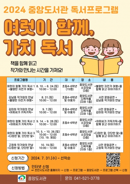 이번 달 10일부터 10월 26일까지 매주 토요일 오전 10시부터 12시까지 독서토론은 중앙도서관 소강좌실에서 작가와의 만남은 다목적홀에서 운영하며 참여는 천안시 도서관 누리집에서 신청할 수 있으며 기타 자세한 사항은 중앙도서관으로 문의하면 된다.