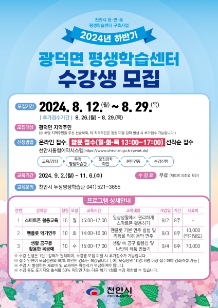 [세종타임즈] 천안시 광덕면·북면·입장면 평생학습센터가 오는 12일부터 29일까지 2024년 하반기 교육 수강생을 모집한다.