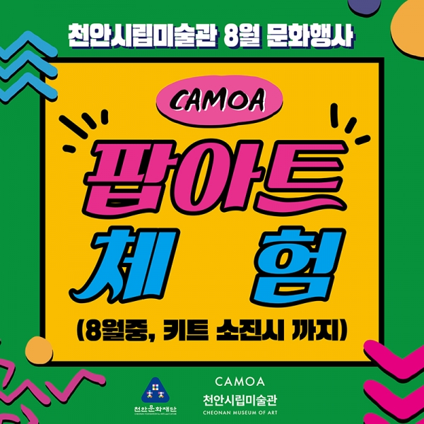본 문화행사는 전시와 연계해 천안시립미술관 로비에서‘CAMOA 팝아트 체험’을 오는 8월 2일 ~ 8월 31일까지 진행한다.