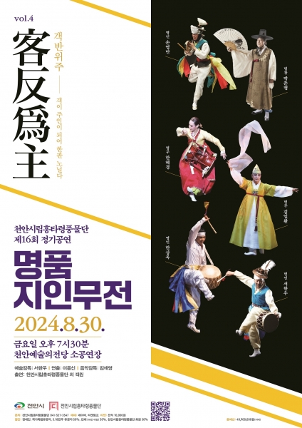 [세종타임즈] 천안시는 오는 30일 천안시립흥타령풍물단이 천안예술의전당 소공연장에서 제16회 정기공연 ‘객반위주4-명품지인무전’을 개최한다고 밝혔다.
