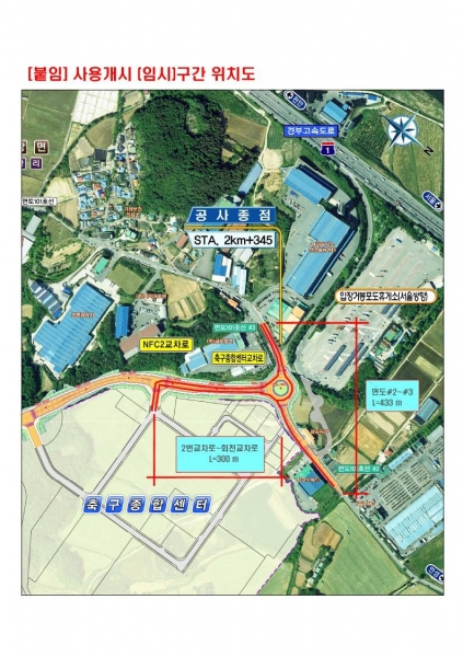 천안시는 서북구 입장면 가산리 일대에 개설 중인 대한민국 축구종합센터 진입도로 전체 3.0km 중 원형교차로를 포함한 연곡길~축구종합센터 733m 구간을 개통했다고 9일 밝혔다.