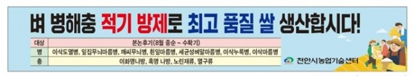 [세종타임즈] 천안시농업기술센터는 16일 고온 다습한 환경이 지속되면서 도열병·잎집무늬마름병·혹명나방·멸구류 등의 발생이 예상됨에 따라 현장을 찾아 영농기술을 지도하고 적기방제를 당부했다.