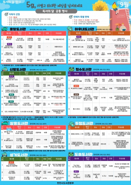 [세종타임즈] 천안시 도서관은 9월 한 달 동안 ‘5g, 가볍고 위대한 세상을 넘겨보세요’라는 표어 아래 행사를 운영한다고 26일 밝혔다.