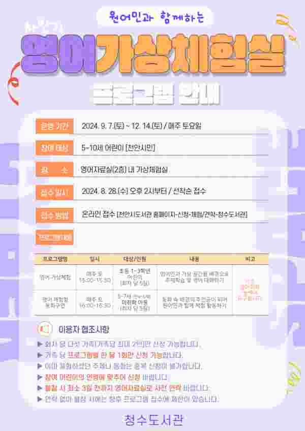 [세종타임즈] 천안시 청수도서관은 2024년 9월부터 12월까지 ‘원어민과 함께하는 하반기 가상체험실 프로그램’을 지속 운영한다고 밝혔다.