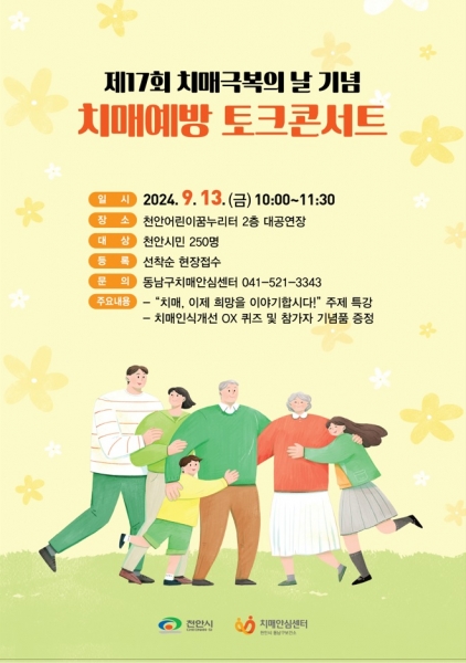 [세종타임즈] 천안시 동남구 치매안심센터는 9월 13일 천안어린이꿈누리터 대공연장에서 치매 인식 개선과 치매 극복을 위한 ‘제17회 치매극복의 날 기념 치매예방 토크 콘서트’를 개최한다고 29일 밝혔다.