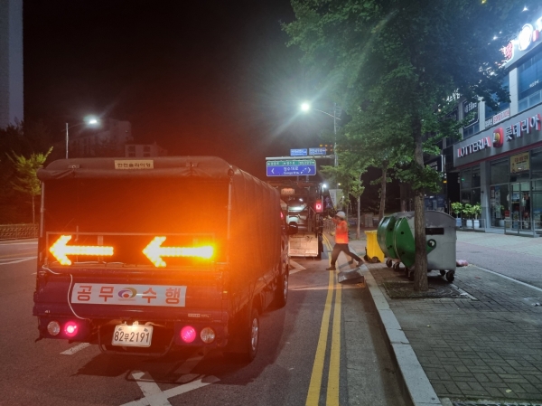 교통사고 위험구역에서 생활폐기물 수거시 안전성 확보를 위해 차선 변경을 유도하는 가드 차량을 운영하고 청소차량에 안전경광등을 설치해 운전자 시야를 확보했다.