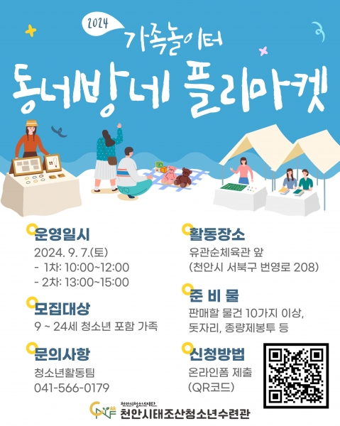 [세종타임즈] 천안시청소년재단 천안시태조산청소년수련관은 오는 4일까지 2024 가족놀이터 ‘동네방네 플리마켓’ 프로그램 참여 가족을 모집한다고 밝혔다.