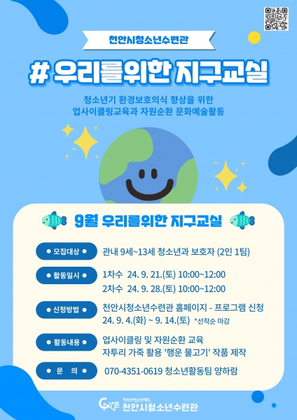 [세종타임즈] 천안시청소년재단 천안시청소년수련관은 오는 13일까지 ‘우리를 위한 지구교실’ 프로그램 참가자를 선착순 모집한다.