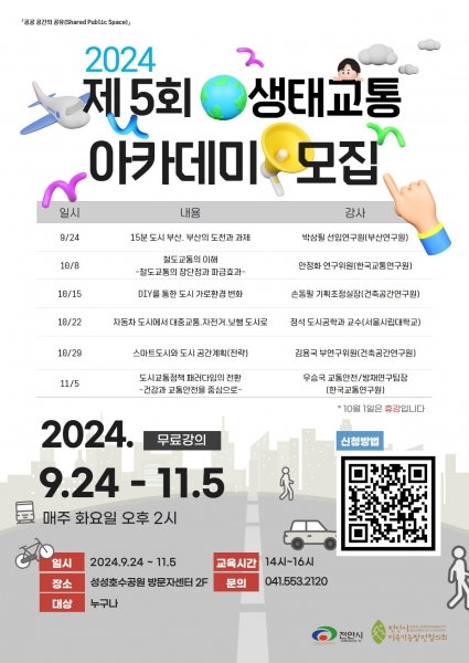 [세종타임즈] 천안시와 천안시지속가능발전협의회는 오는 23일까지 ‘제5회 생태교통 아카데미’ 교육생 40명을 선착순으로 모집한다.