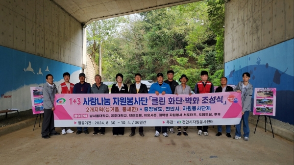 봉사단은 충청남도·천안시·자원봉사단체가 2010년 구성한 단체이며 이번 화단·벽화 조성에는 남서울대학교, 공주대학교, 이웃사촌, 도담도담, 푸우, 브레드림, 2024대학생자원봉사서포터즈 등 7개 단체 132명이 참여했다.