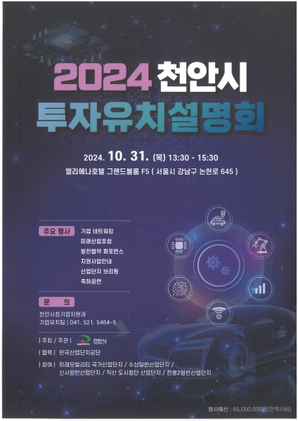 투자유치설명회와 관련된 사항은 천안시청 기업지원과 기업유치팀 으로 문의하면 된다.