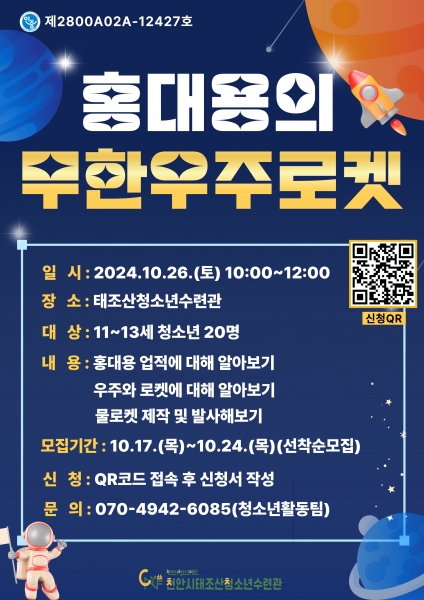[세종타임즈] 천안시청소년재단 천안시태조산청소년수련관은 24일까지 청소년수련활동인증 프로그램인 ‘홍대용의 무한우주로켓’의 참가자를 선착순으로 모집한다고 18일 밝혔다.