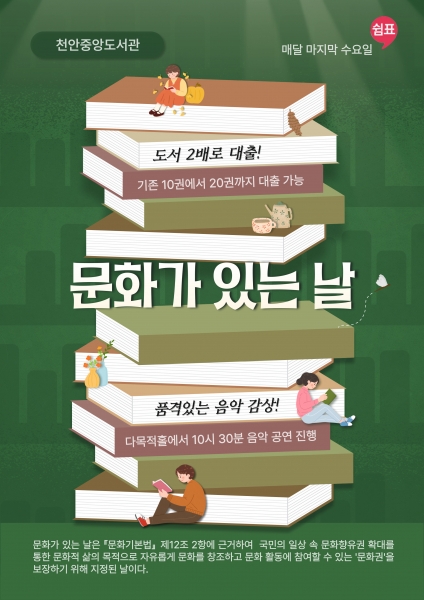 문화가 있는 날은 ‘문화기본법’ 제12조 2항에 근거해 문화체육관광부와 지역문화진흥원에서 지원하는 사업으로 전국 도서관을 비롯한 다양한 문화 기관에서 매달 마지막 수요일과 그 주간에 다양한 문화혜택을 제공하는 날이다.