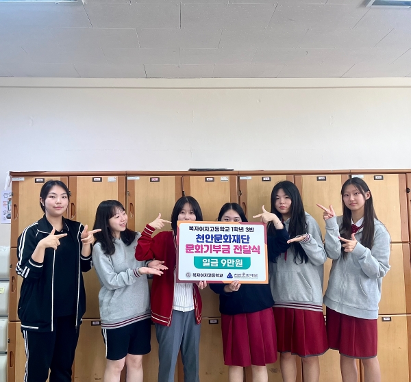 [세종타임즈] 복자여자고등학교 1학년 3반 학생들이 19일 천안문화재단에 기부금 9만원을 전달했다고 밝혔다.