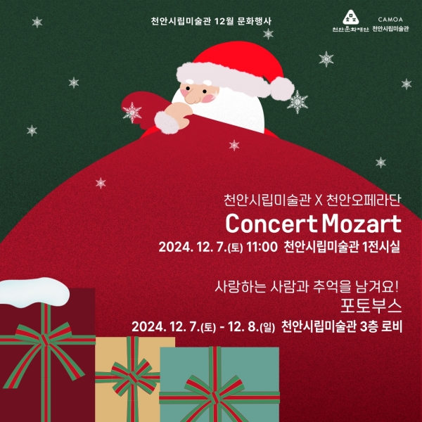 12월 문화행사에는 지역 예술단체인 천안오페라단과 협업해 ‘Concert Mozart’를 운영할 예정이며 ‘Concert Mozart’는 미술관 전시실 안에서 전시 감상과 함께 음악회를 즐길 수 있는 프로그램이다.