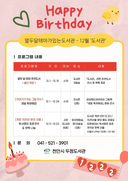 두정도서관 관계자는 “‘추천도서와 원화 전시’ 관련 행사를 통해 개관 15주년을 맞이한 두정도서관에서 더욱 따뜻하고 행복한 연말을 보내시길 바란다”고 전했다.