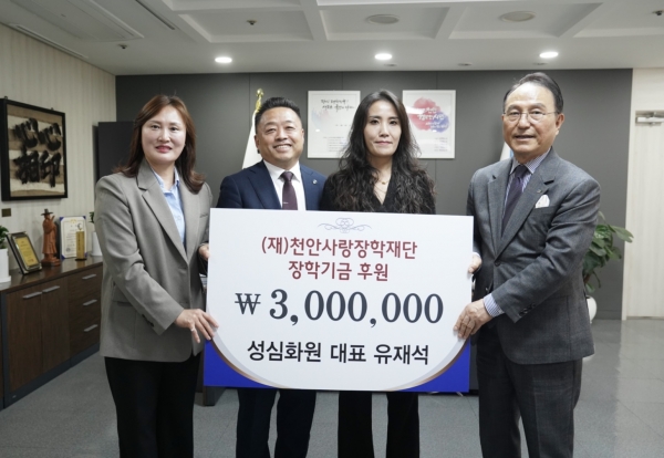 [세종타임즈] 천안사랑장학재단은 지난 2일 유재석 성심화원 대표가 지역우수 인재 육성 및 어려운 학생들을 위해 장학기금 300만원을 기부했다고 밝혔다.