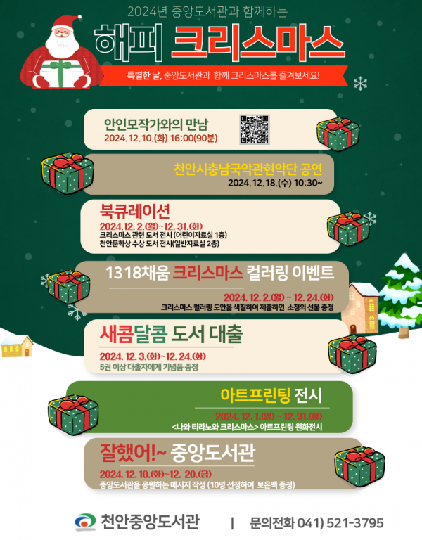 행사 내용으로는 △북큐레이션 △1318채움 크리스마스 컬러링 △새콤달콤 도서 대출 △ 나와 티라노와 크리스마스 △잘했어~ 중앙도서관을 진행한다.