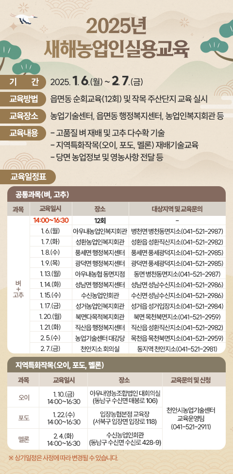 [세종타임즈] 천안시농업기술센터는 새해 영농설계를 위한 ‘2025년 새해농업인실용교육’을 각 읍면동 및 특화작목 주산단지에서 내년 1월 6일부터 2월 7일까지 추진할 계획이라고 밝혔다.