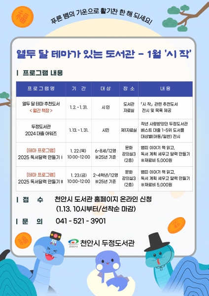 [세종타임즈] 천안시 두정도서관이 올해 ‘열두달 테마가 있는 도서관’을 운영한다고 6일 밝혔다.