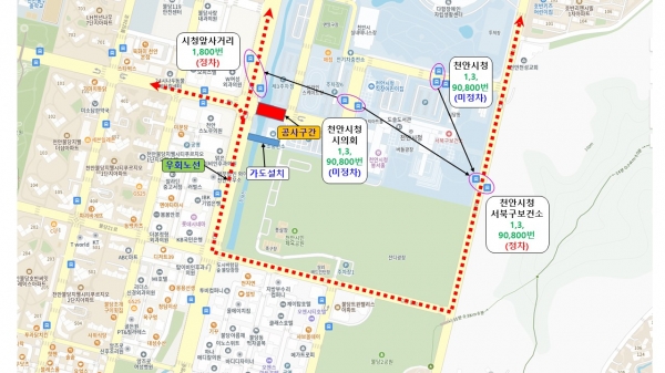 해당 구간을 통행하는 시내버스 1·3·10·90·800번 노선은 교통 통제 기간 불당동 상업지구 방향으로 우회 운행한다.