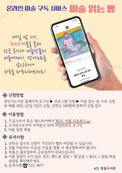 천안시 도서관 회원이면 누구나 신청할 수 있으며 매월 천안시도서관 홈페이지에서 선착순 100명을 선정해 BGA 어플리케이션 1개월 구독권을 무료로 제공한다.