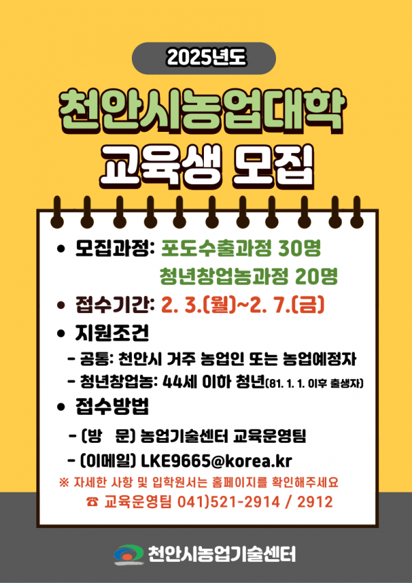 [세종타임즈] 천안시농업기술센터는 오는 2월 3~ 7일 ‘2025년도 천안시농업대학’ 교육생을 모집한다고 20일 밝혔다.
